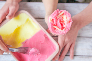 ピンク色のイチゴ味と黄色のバナナ味の組み合わせです。単品で食べるも良し、2つの味を一緒に楽しむのも良し。